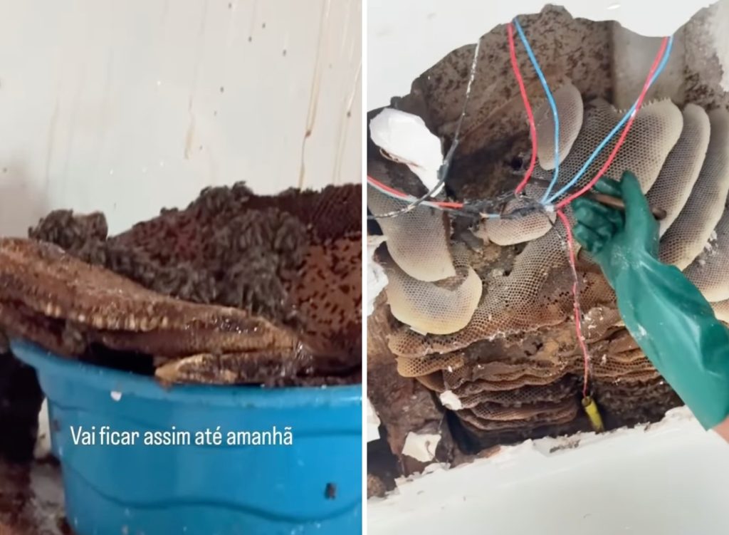 A verdadeira escala da infestação de abelhas só foi revelada após a intervenção de um especialista. Ao ser acionado pela família para avaliar a situação, o profissional realizou uma inspeção minuciosa e, com a devida autorização, procedeu à abertura do gesso na área da cozinha. O que se descobriu foi uma cena impressionante: uma colmeia de proporções gigantescas que, pela sua estrutura e pelo volume acumulado, foi estimada em ter estado instalada na residência por vários anos. A remoção dessa monumental estrutura resultou na impressionante quantia de aproximadamente 40 litros de mel, demonstrando a atividade contínua e a complexidade do ecossistema que se desenvolveu secretamente no forro da casa. Durante o meticuloso processo de retirada, mais uma descoberta surpreendente veio à tona: havia abelhas e vestígios da colmeia também na parede de gesso do quarto da filha, Maria Eduarda, aprofundando a preocupação com a segurança e o alcance da infestação.