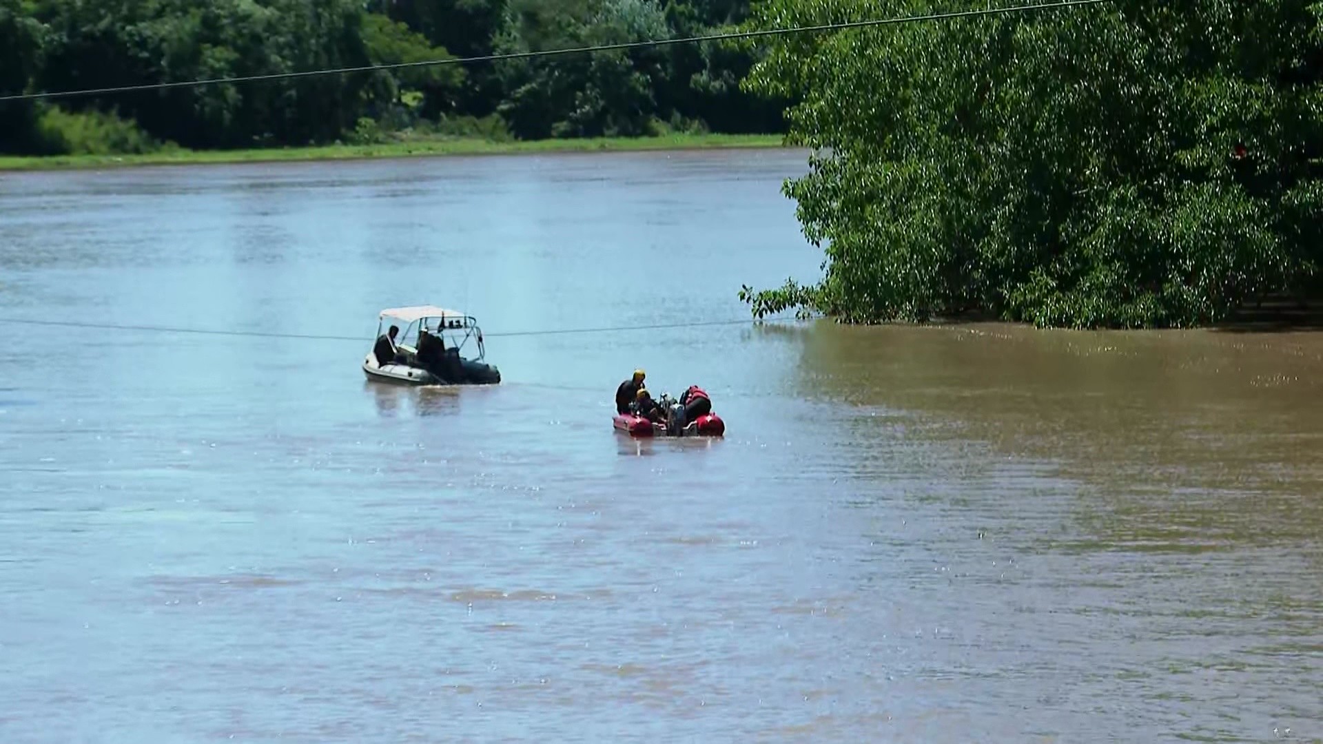 A forte correnteza do rio, causada pelas chuvas recentes, tem dificultado os trabalhos de busca.