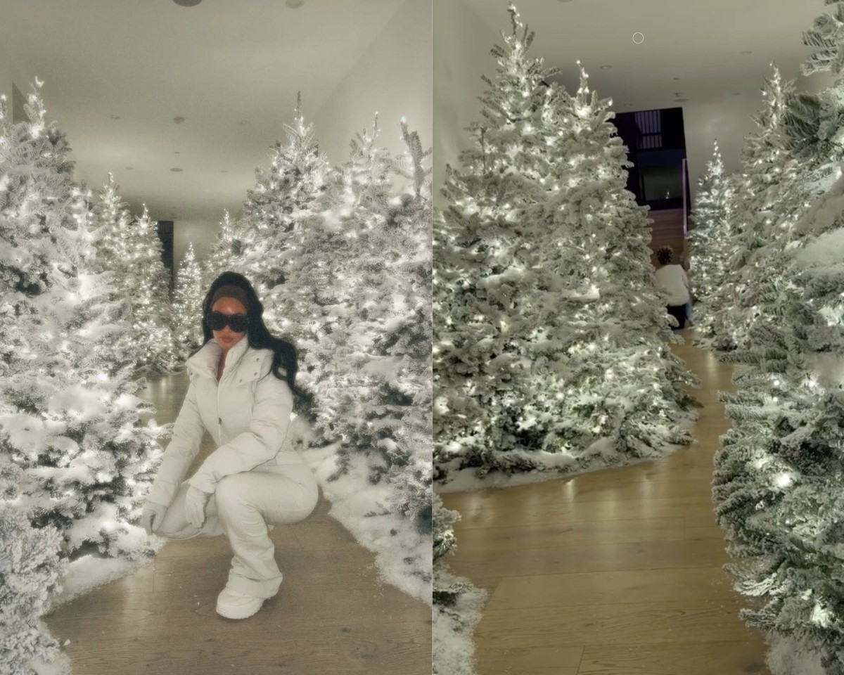 O tema principal foi uma “floresta de Natal” coberta por neve artificial, transformando o interior de sua mansão em uma paisagem invernal encantada.