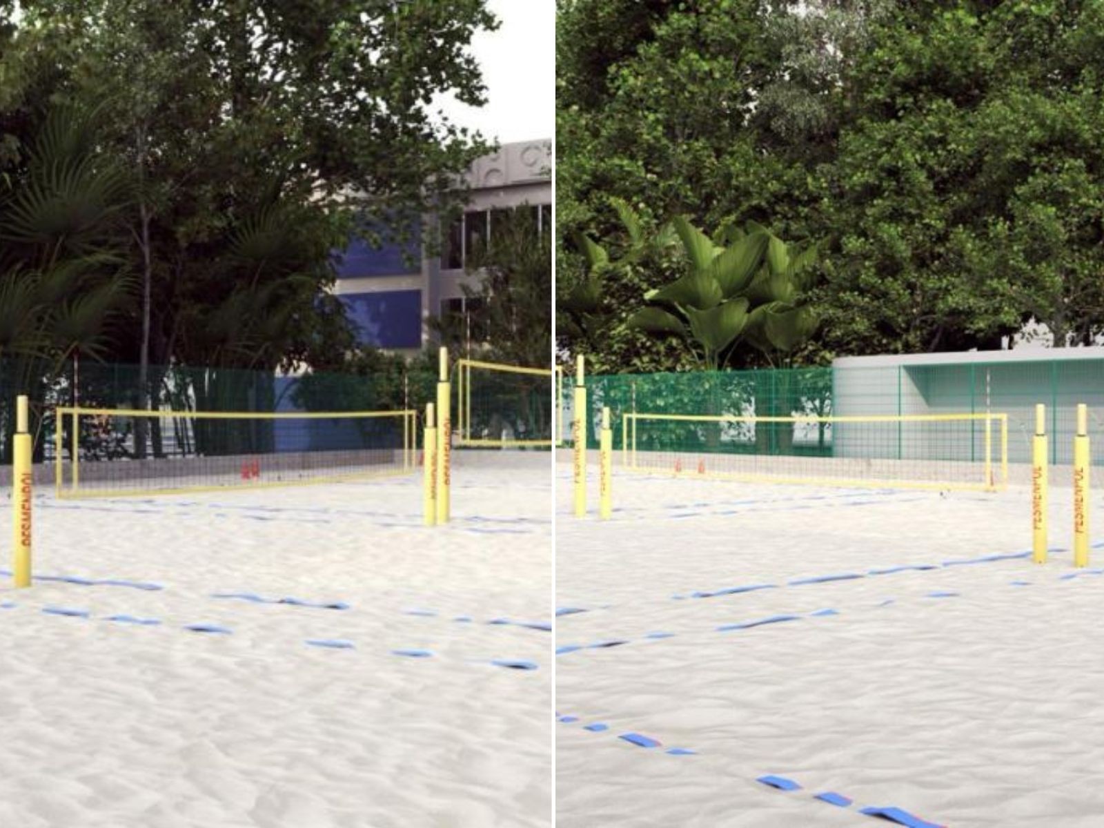 O projeto final das quadras de areia prevê uma estrutura completa e moderna para a prática esportiva. Incluirá muretas de contenção, alambrados e gradis de segurança, além de postes equipados com refletores e luminárias para garantir a utilização noturna. O piso será composto por areia tratada, e haverá postes conjugados específicos para beach tennis e futevôlei, acompanhados de redes, fitas demarcatórias e todos os acessórios necessários. Complementando as instalações, o complexo contará com vestiários dotados de chuveiros acessíveis, visando atender a todos os usuários.